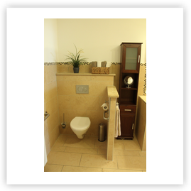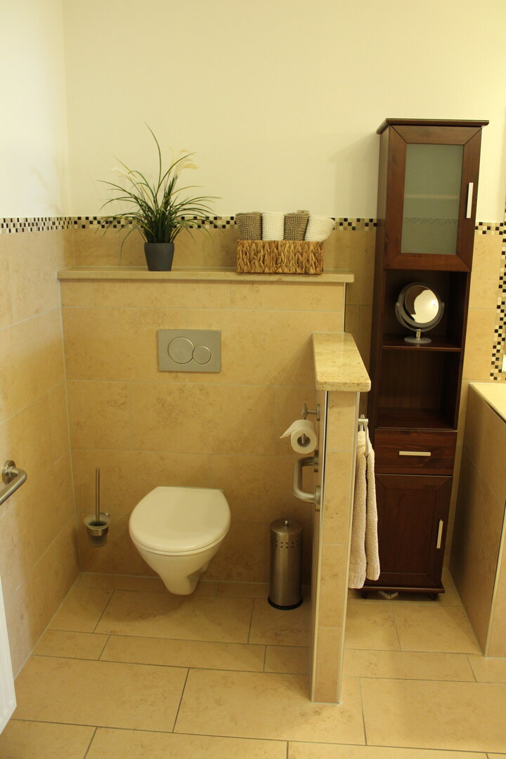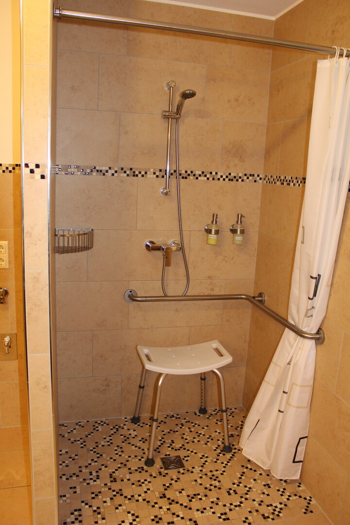 - großes modernes Badezimmer mit begehbarer Dusche und WC (mit Haltegriffen), 2 Waschbecken (unterfahrbar), Schminkspiegel, Fön, Duschhocker, Grundausstattung: Seife, Duschbad, Shampoo, Toilettenpapier, Hand- und Duschtücher, Bademäntel