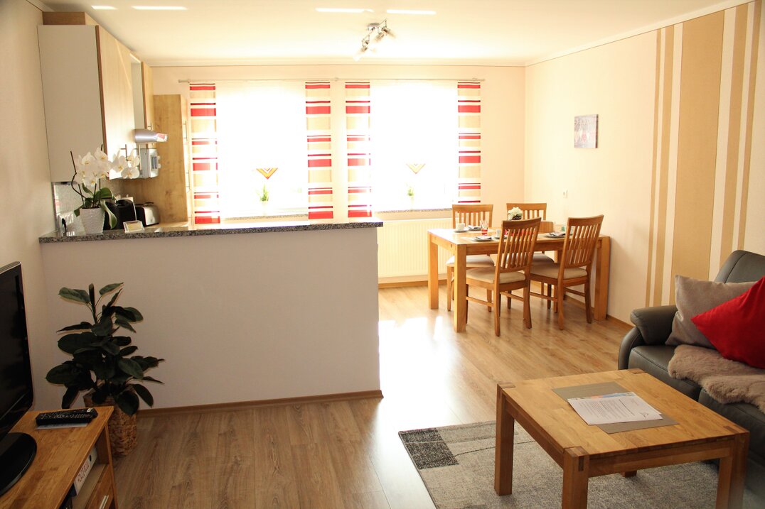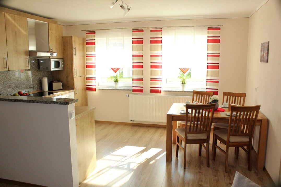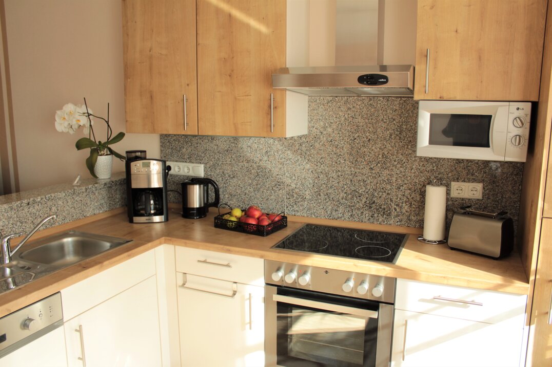 - gemütlicher Wohn-/Essbereich, vollausgestattete, moderne Einbauküche mit Geschirrspüler, Cerankochfeld, Backofen, Kühlschrank mit Gefrierfach, Mikrowelle, Kaffeeautomat (für Bohnen und Pulver) mit Dauerfilter, Kaffeefilter zum Selberbrühen, Wasserkocher, Mixer, Toaster, Eierkocher, Brotmaschine, komplettes Speise- und Kochgeschirr sowie Gläsersortiment, Küchenutensilien, Erstausstattung an Spülmaschinentabs, Geschirrspülmittel und Müllbeutel, Geschirrtücher, Spüllappen, Kaffeefilter, Gewürze (Salz, Pfeffer, Zucker, Essig, Öl)
